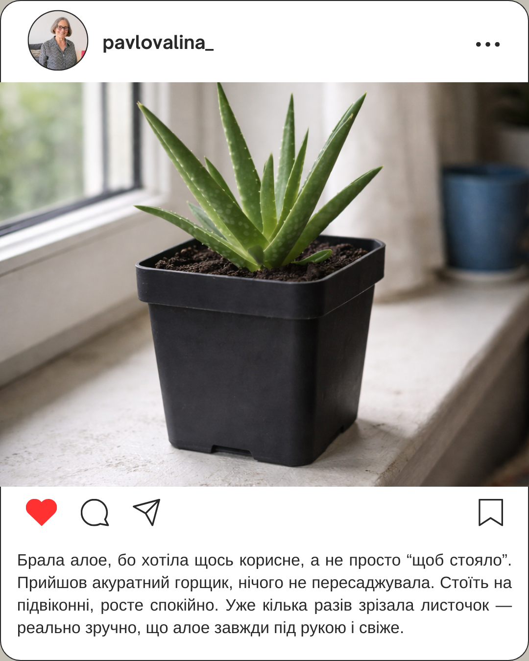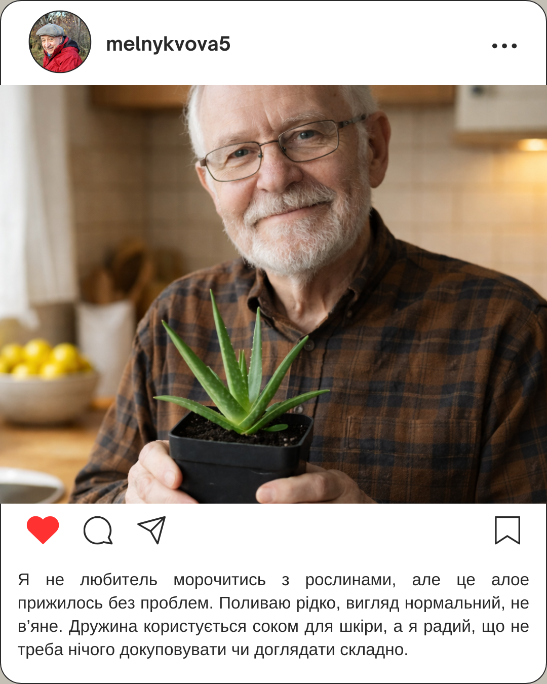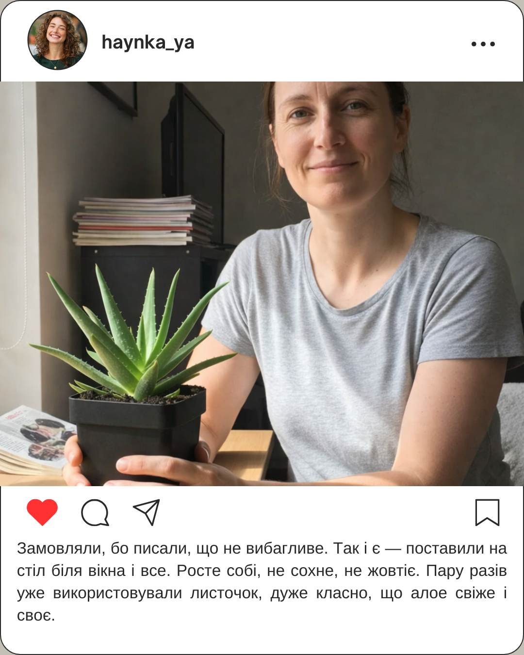 Алое «Ліра» дозволяє мати першоджерело цієї сировини вдома — без стабілізаторів, спиртів і промислової обробки.