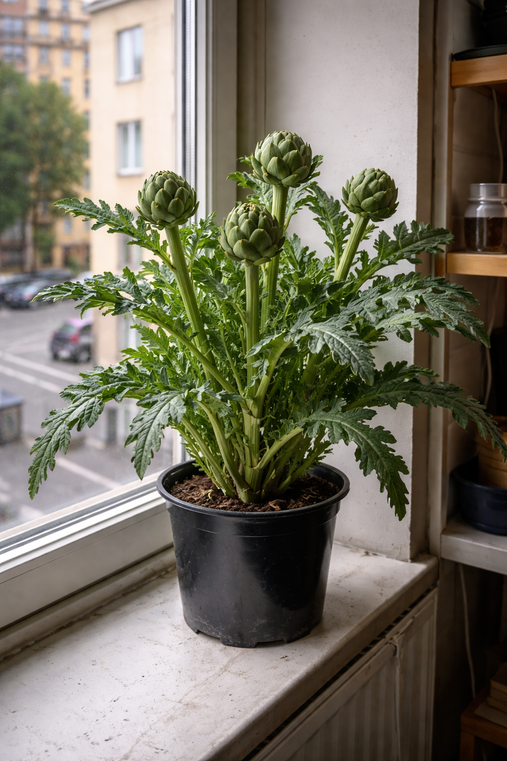 Поставте горщик Р9 у добре освітлене місце — підвіконня або засклений балкон. Артишок любить світло і стабільну температуру.