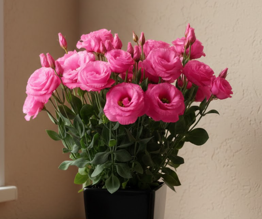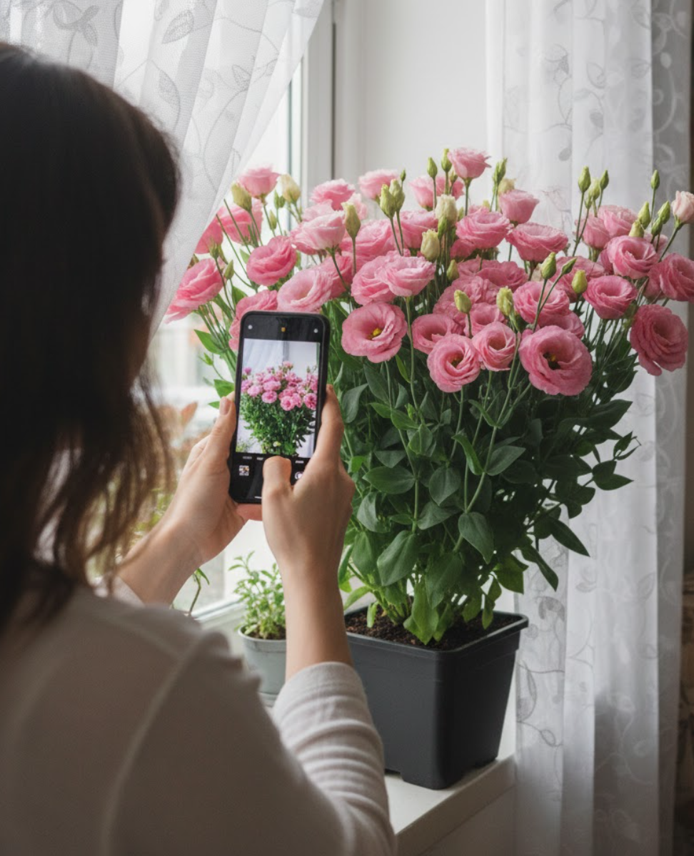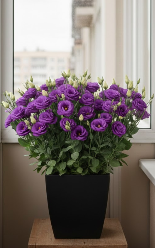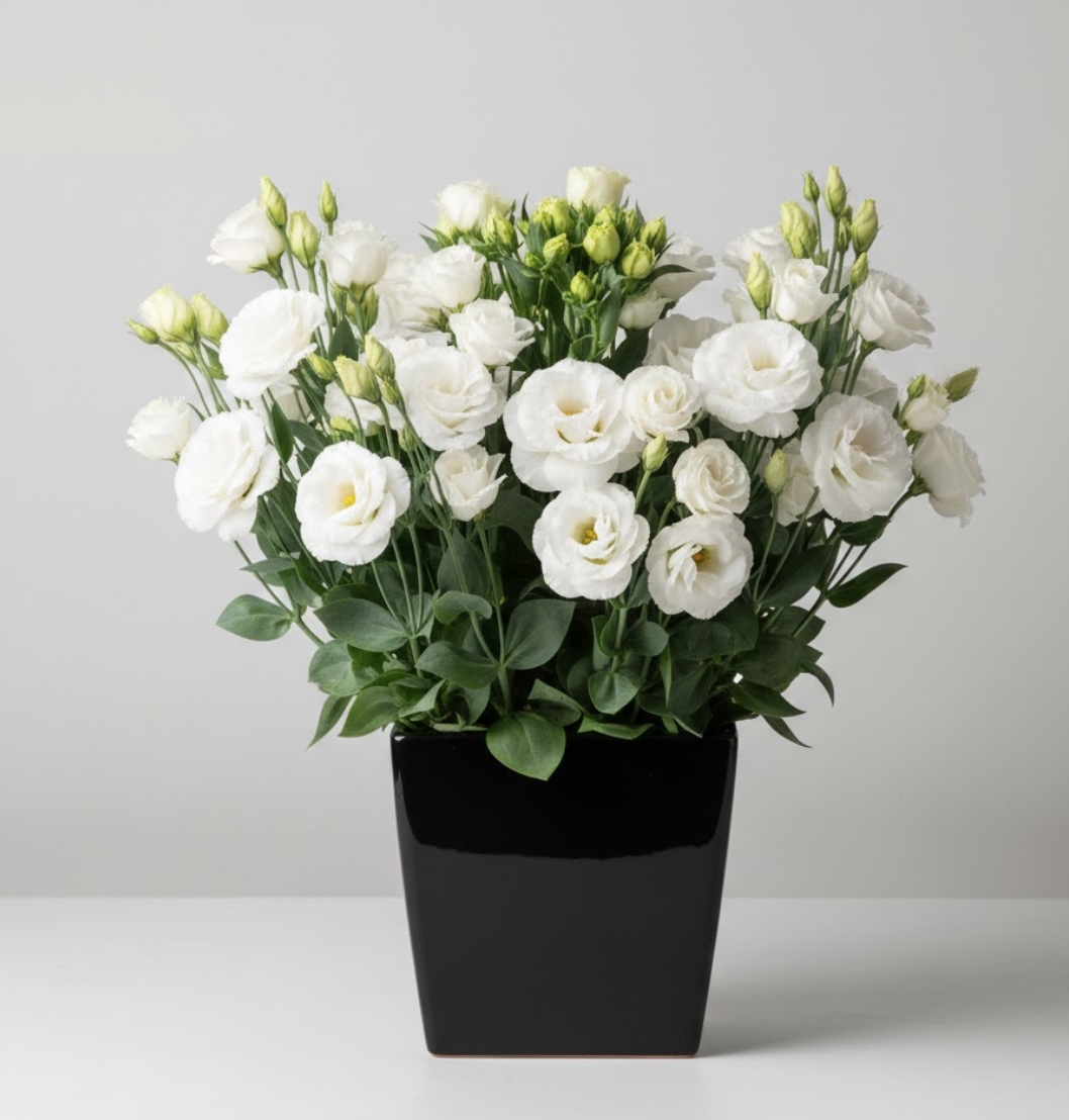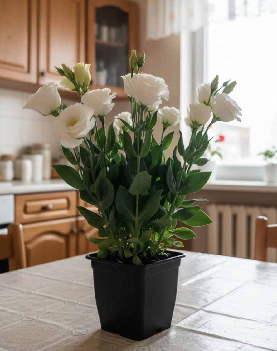 Лізіантус «Адалін» — це великі шовковисті квіти з багатошаровими пелюстками виглядають як з бутик-флористики. Кущ формується компактно та акуратно — приблизно 35–55 см заввишки, без хаотичного розростання. На піку цвітіння рослина може одночасно тримати 20–40+ бутонів, тому вигляд завжди об’ємний і святковий, навіть у звичайній квартирі.