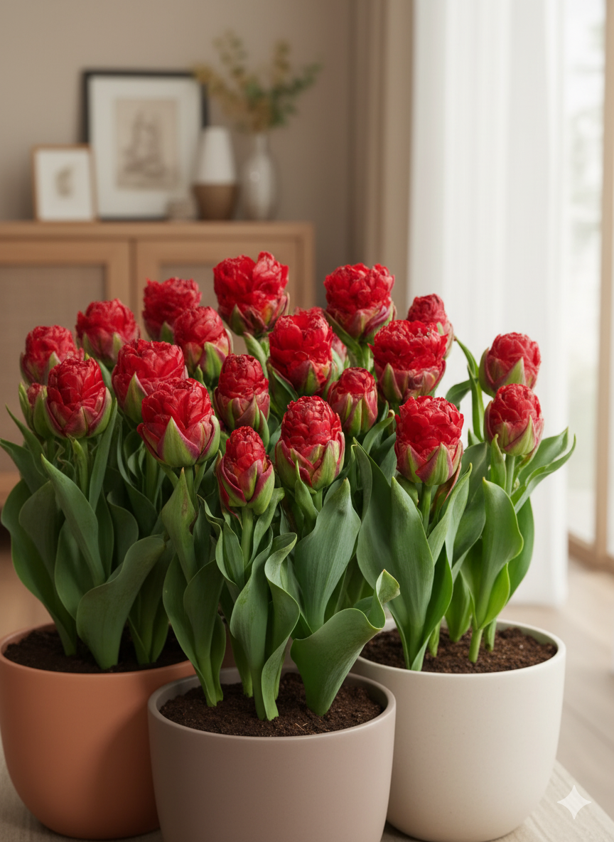 Для успішного вирощування тюльпанів «Ice Cream» у кімнатних умовах оберіть світле місце з м’яким, розсіяним освітленням.